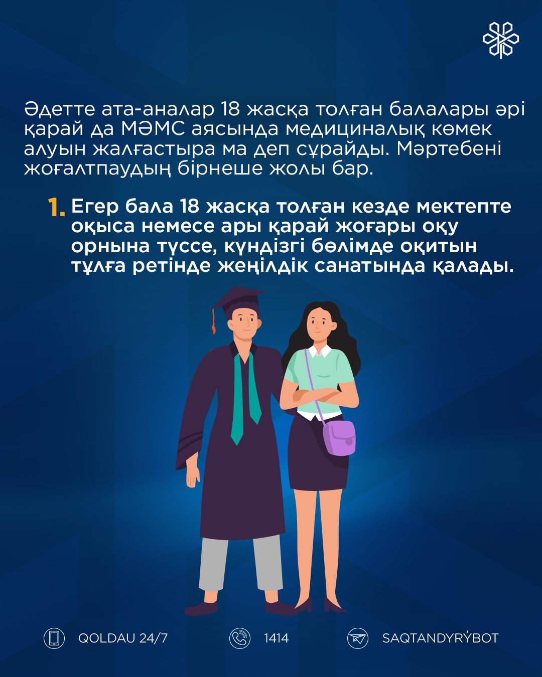 Әдетте ата-аналар 18 жасқа толған балалары әрі қарай да МӘМС аясында медициналық көмек алуын жалғастыра ма деп сұрайды. Мәртебені жоғалтпаудың бірнеше жолы бар.