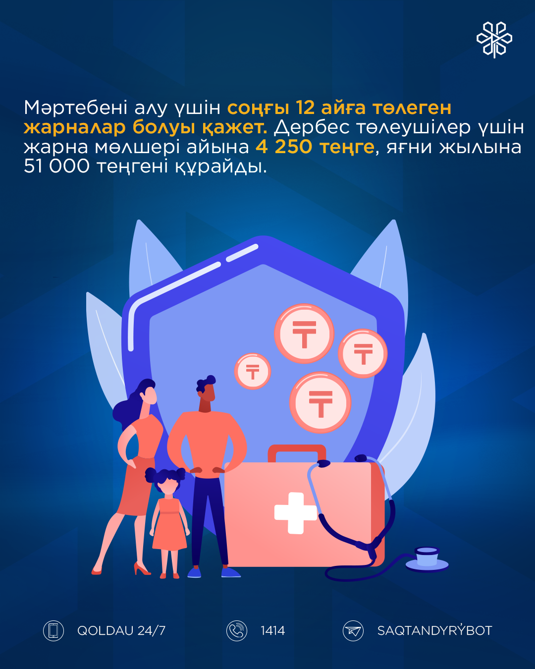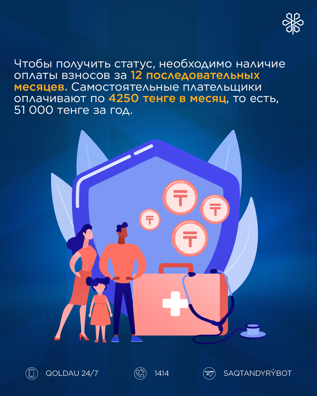 Чтобы получить статус, необходимо наличие оплаты взносов за 12 последовательных месяцев. Самостоятельные плательщики оплачивают по 4250 тенге в месяц, то есть, 51 000 тенге за год.