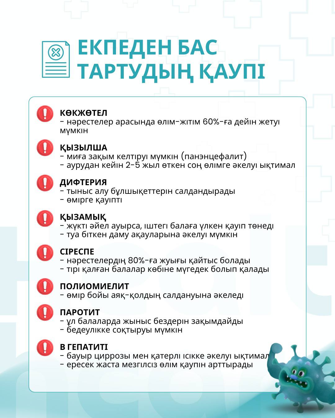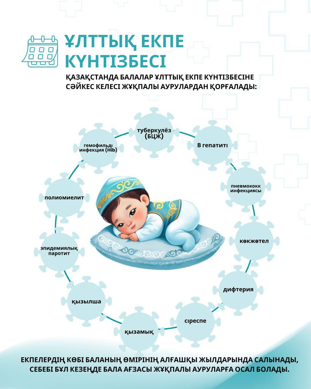 ❇️Все вакцины проходят многоступенчатую проверку качества и находятся под строгим контролем на каждом этапе - от производства до применения. Вакцинопрофилактика в Казахстане осуществляется по Национальному календарю прививок, основанному на международных рекомендациях и адаптированному к возрастным и медицинским потребностям детей.