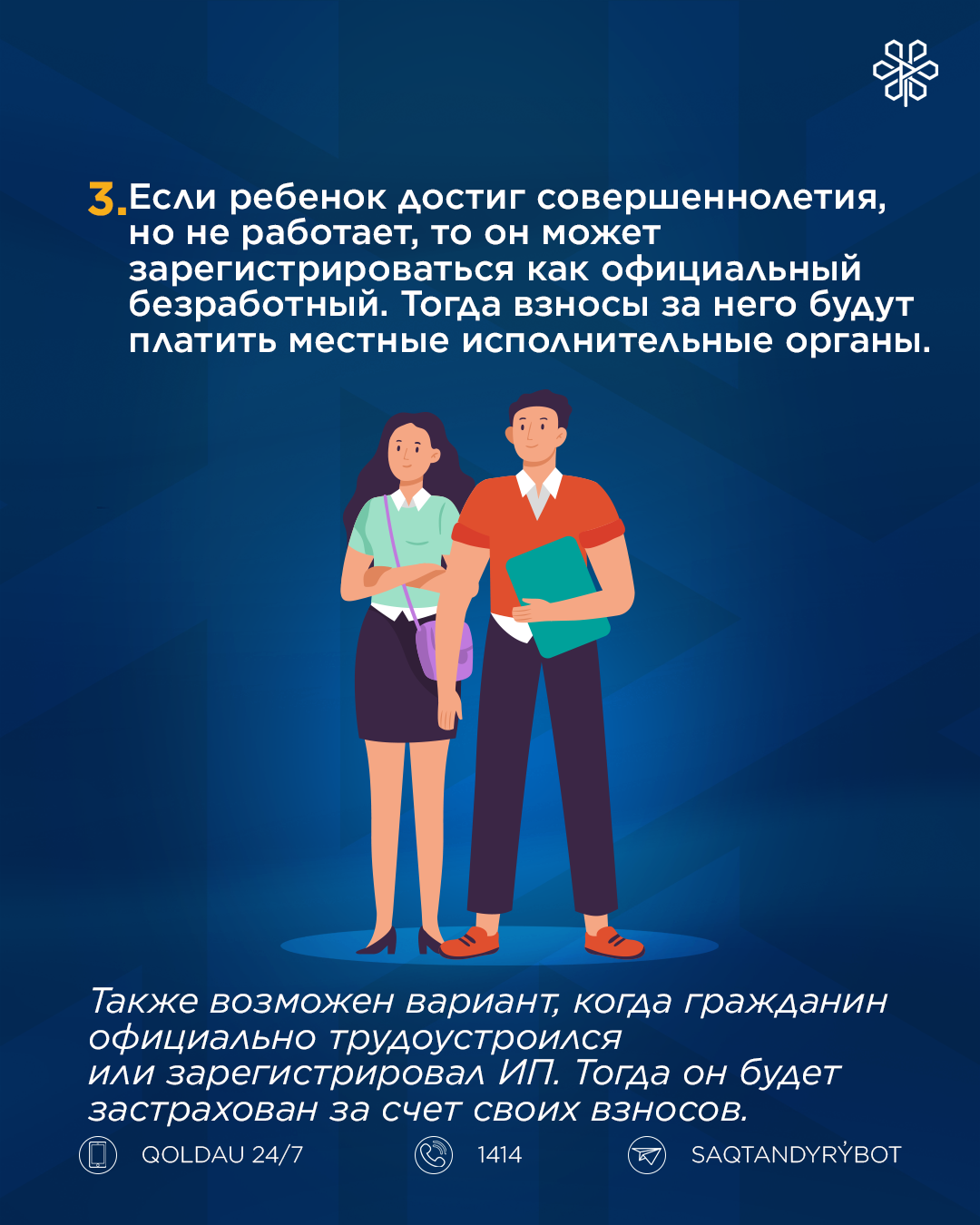- Егер бала кәмелет жасқа толған соң жұмыс істемесе ресми түрде жұмыссыз ретінде тіркеле алады. Ондай жағдайда жергілікті атқарушы органдар ол үшін жарна төлейді.