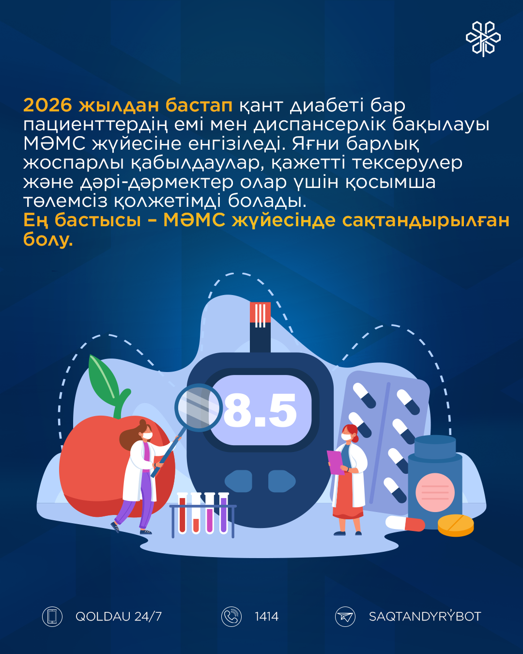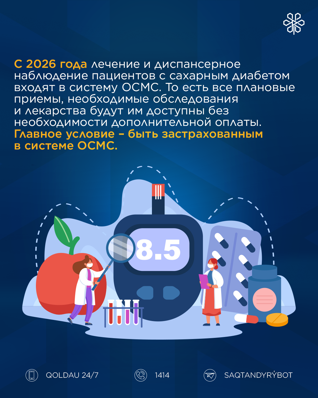С 2026 года лечение и диспансерное наблюдение пациентов с сахарным диабетом входят в систему ОСМС. То есть, все плановые приемы, необходимые обследования и лекарства будут им доступны без дополнительной оплаты. Главное условие – быть застрахованным в системе ОСМС.