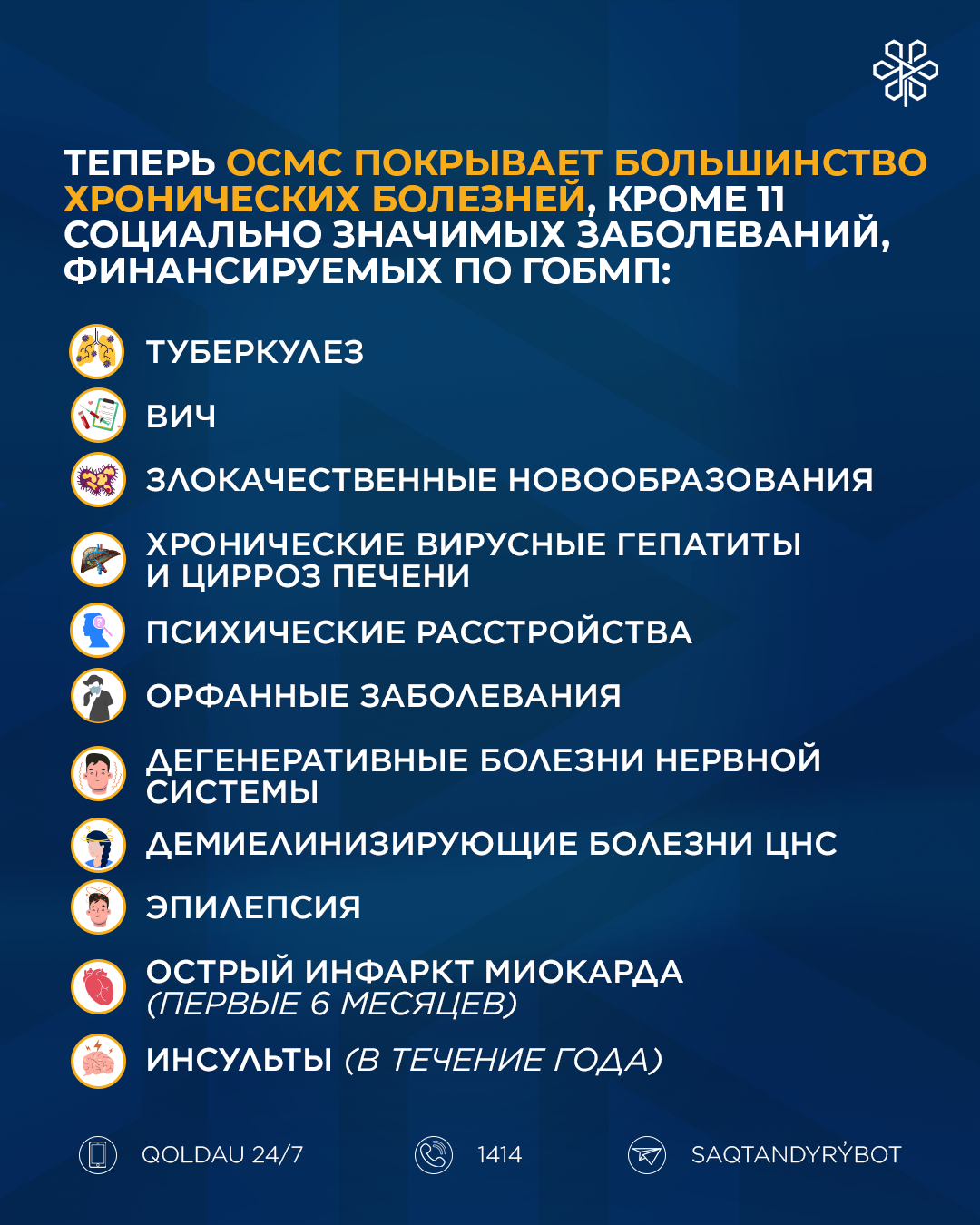 Теперь ОСМС покрывает большинство хронических болезней, кроме 11 социально значимых заболеваний, финансируемых по ГОБМП: туберкулез, ВИЧ, злокачественные новообразования, хронические вирусные гепатиты и цирроз печени, психические расстройства, орфанные заболевания, дегенеративные болезни нервной системы, демиелинизирующие болезни ЦНС, эпилепсия, острый инфаркт миокарда (первые 6 месяцев), инсульты (в течение года).