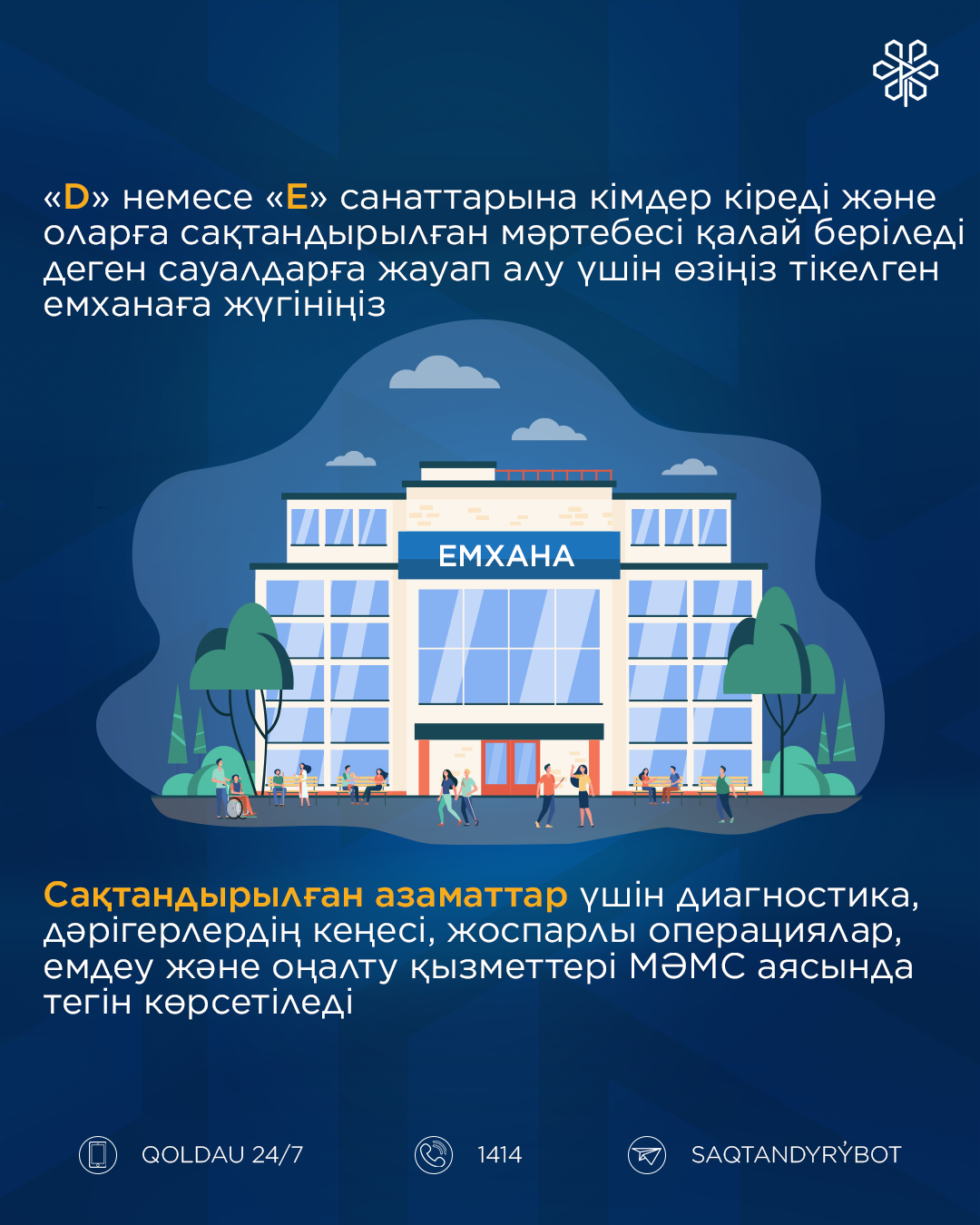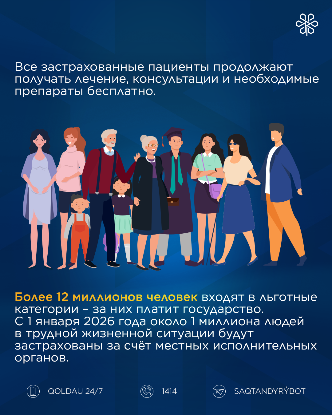 Более 12 миллионов человек входят в льготные категории – за них платит государство. С 1 января 2026 года около 1 миллиона людей в трудной жизненной ситуации будут застрахованы за счёт местных исполнительных органов.